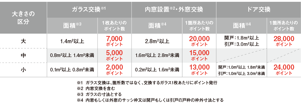 開口部の断熱改修では、1箇所あたりのポイント数×施工箇所数のポイントが発行されます。以下のように設定されています。