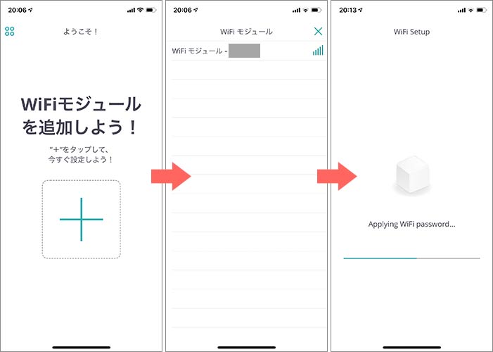 表示されたWi-Fiモジュールをタップすると、接続するネットワーク(自宅のWi-Fiなど)が表示されるので、Wi-Fiのパスワードを入力して、設定完了です。