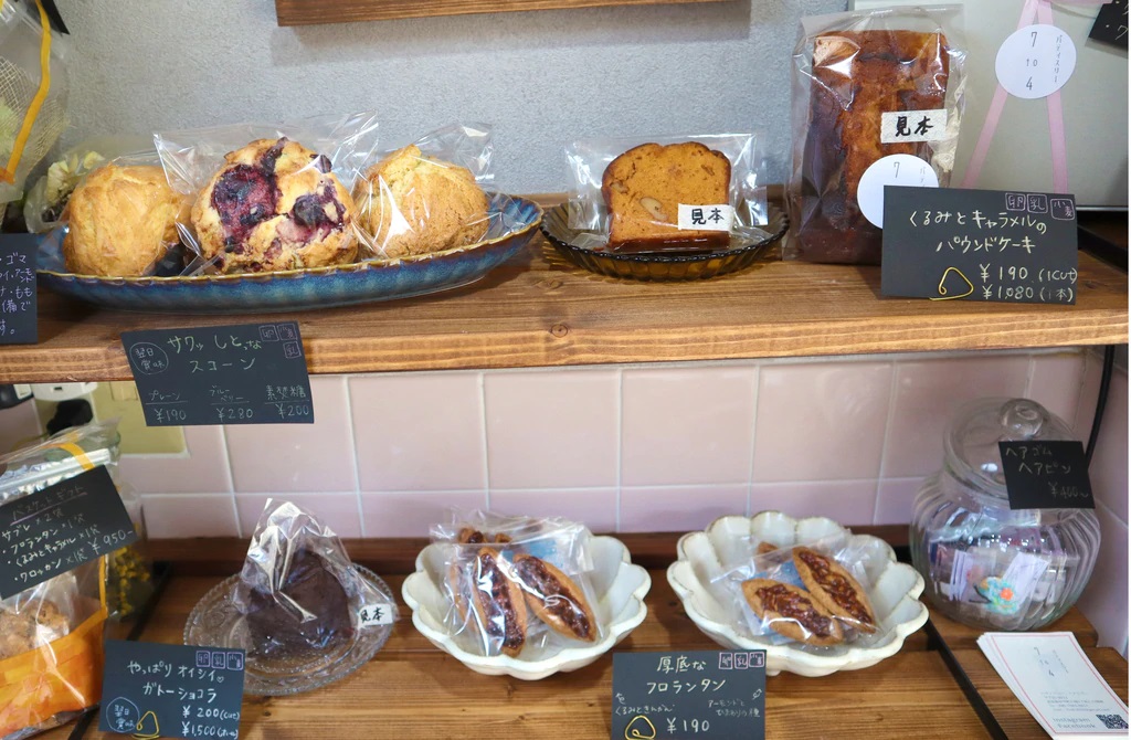 周りが住宅街に囲まれた場所にひっそりと隠れ家のように佇むお菓子屋さん、「パティスリー7to4」。店内に入ると商品棚には定番のパウンドケーキやガトーショコラ、スコーンやラスクなどさまざまな種類の焼き菓子が所せましと並んでいます。