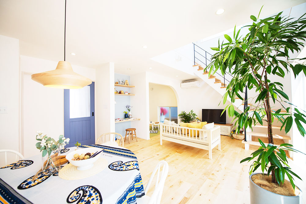鮮やかな柄のテーブルクロスやブルーの引き戸、ソファの黄色いクッション、そして中央のアクセントクロスなど、カラフルな色が点在するお部屋。バランスよく配置されたグリーンも空間に潤いを与えてくれています。