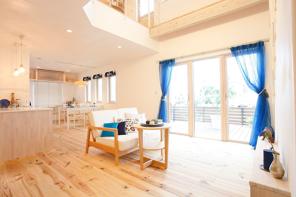 無垢材のフローリングや白い壁といったナチュラルな空間に、青いカーテンやクッションを配置してアクセントが与えられています。