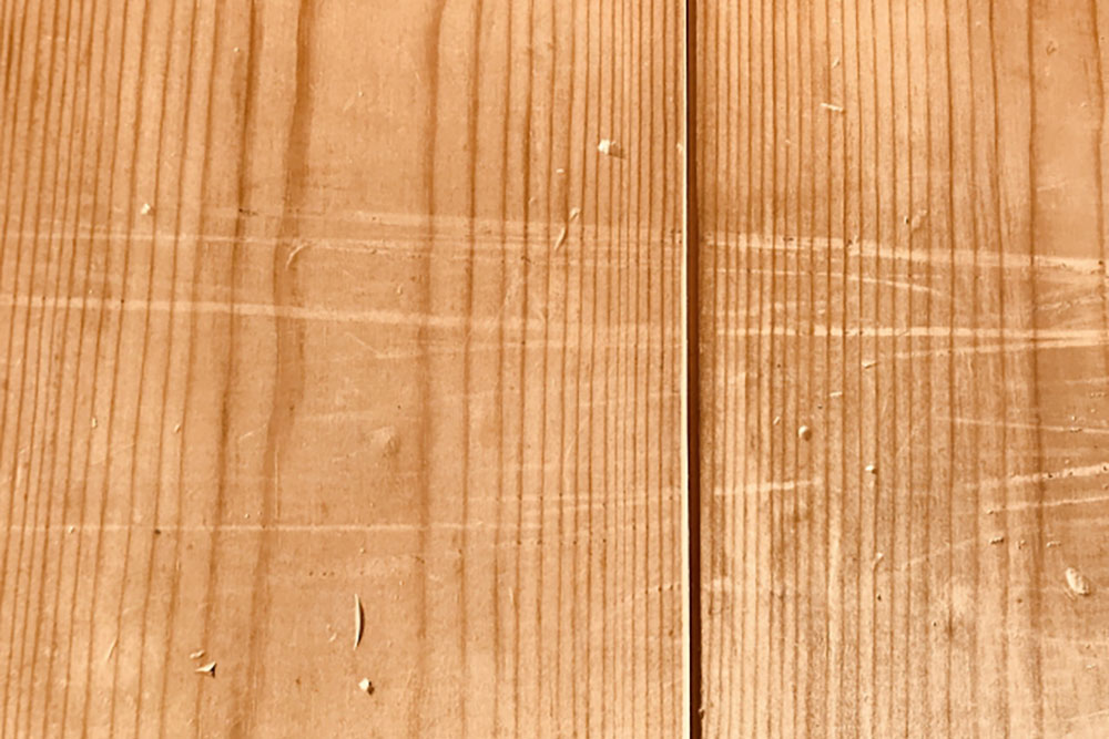 無垢材の中でも、杉材やパイン材のように柔らかい素材は、重たいものを落とすと凹んでしまったりする可能性もあります。しかし、無垢材は天然の木。傷の程度にもよりますが、無塗装の場合は水分を含ませて凹みを膨らませて修復したり、全体を薄く削って引っ掻き傷などを消すことも可能です。集成材の床ではこのようなことはできません。