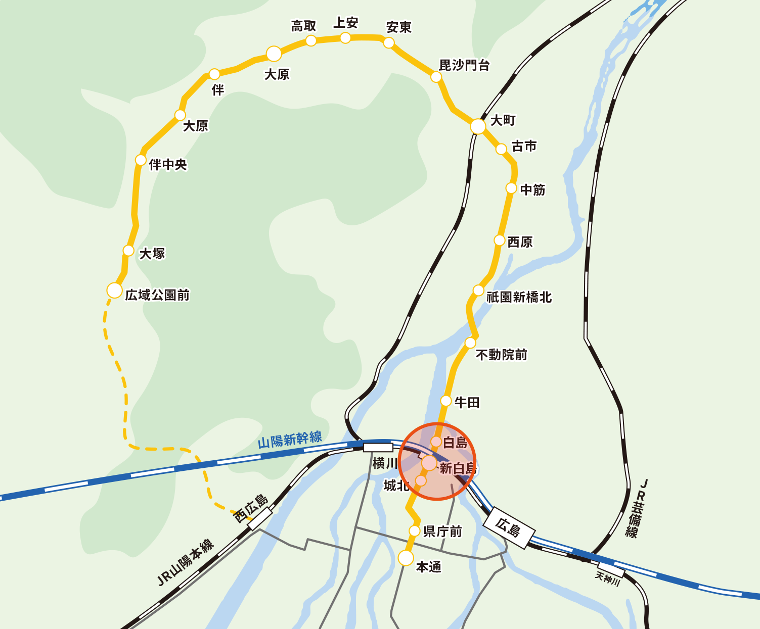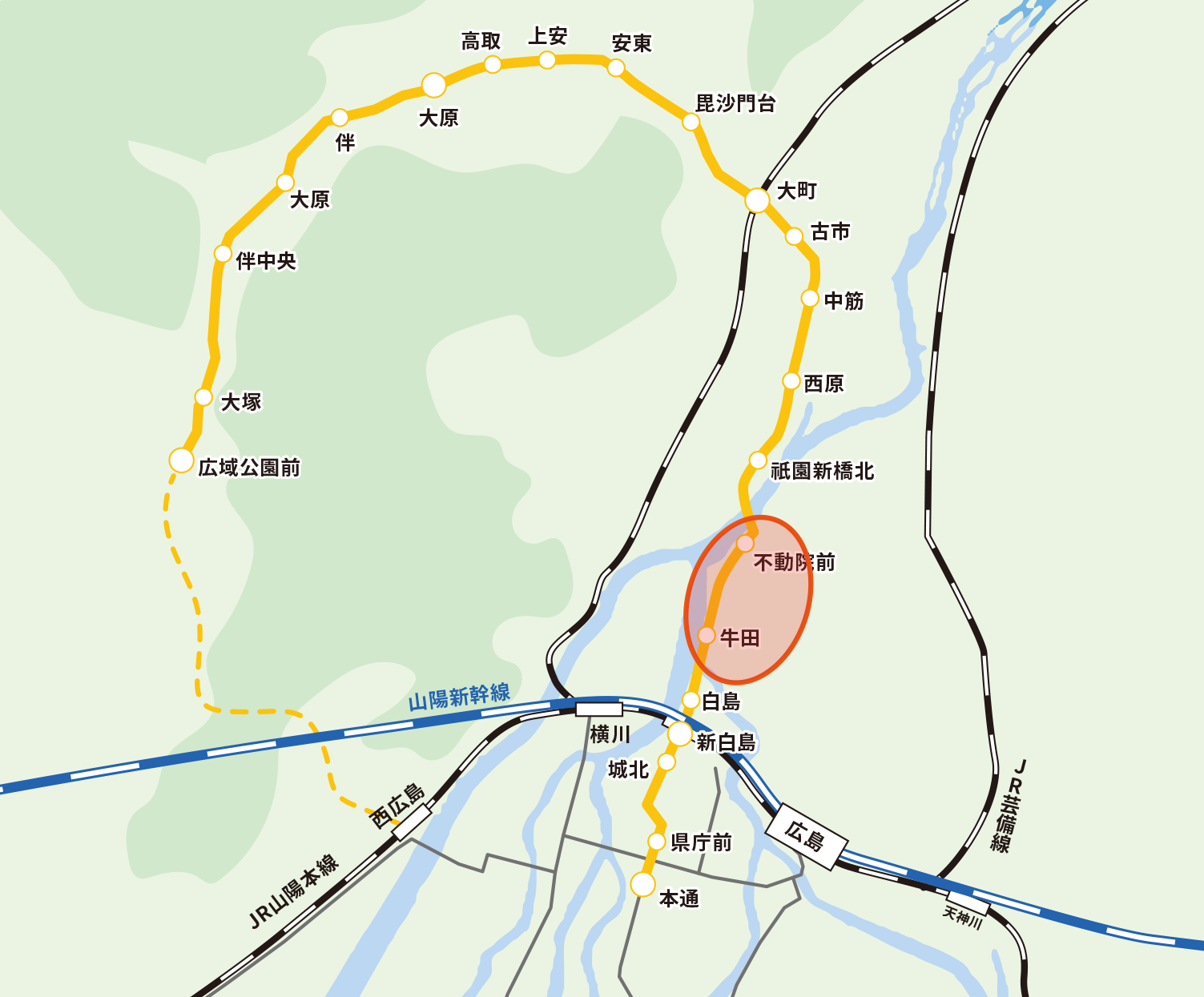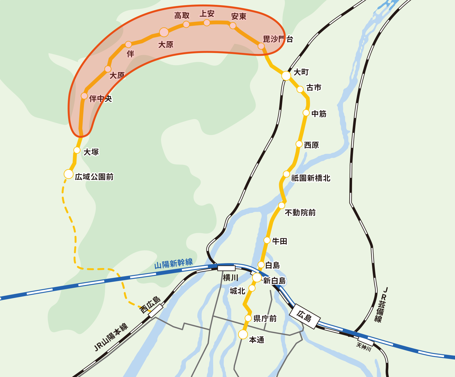 アストラムラインは当初、広島市中心部と広島市北西部(安佐南区・あさみなみく)の住宅団地を結ぶ公共交通として建設が進められていました。