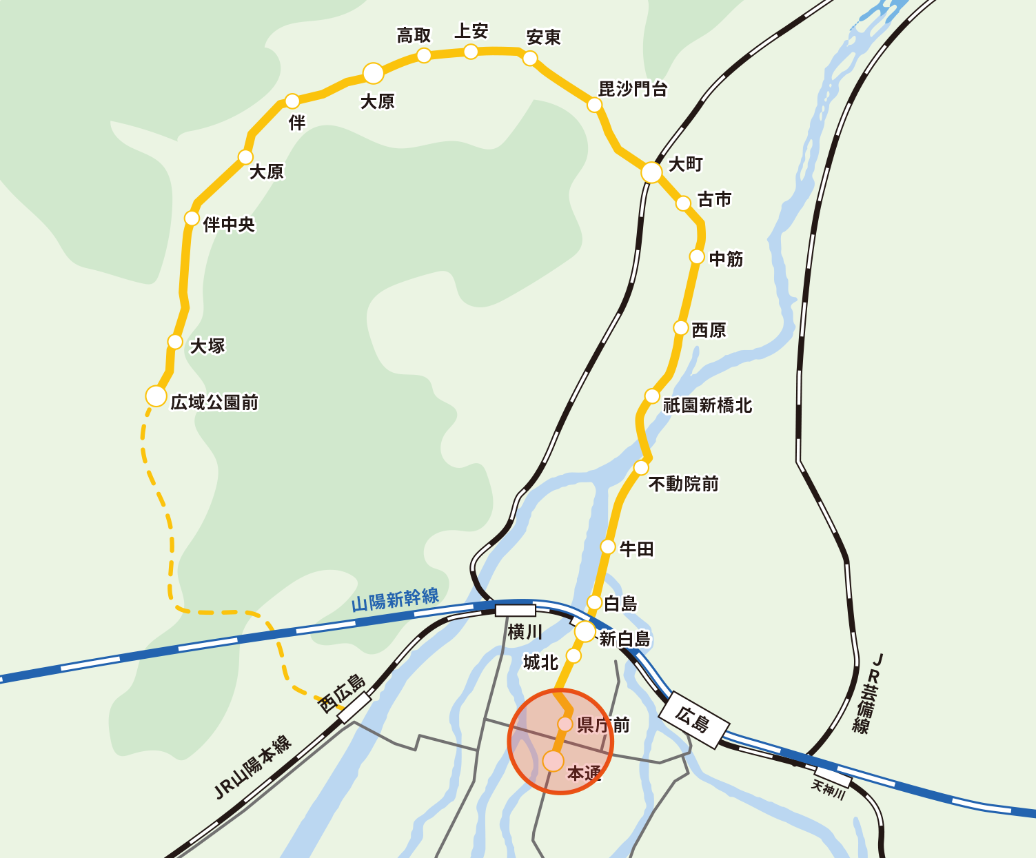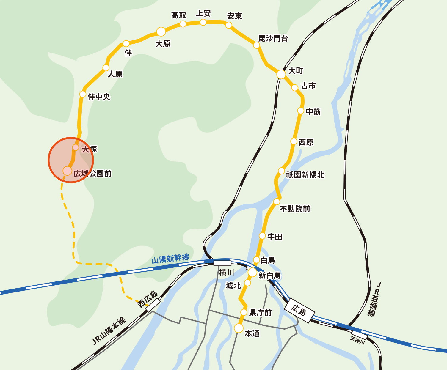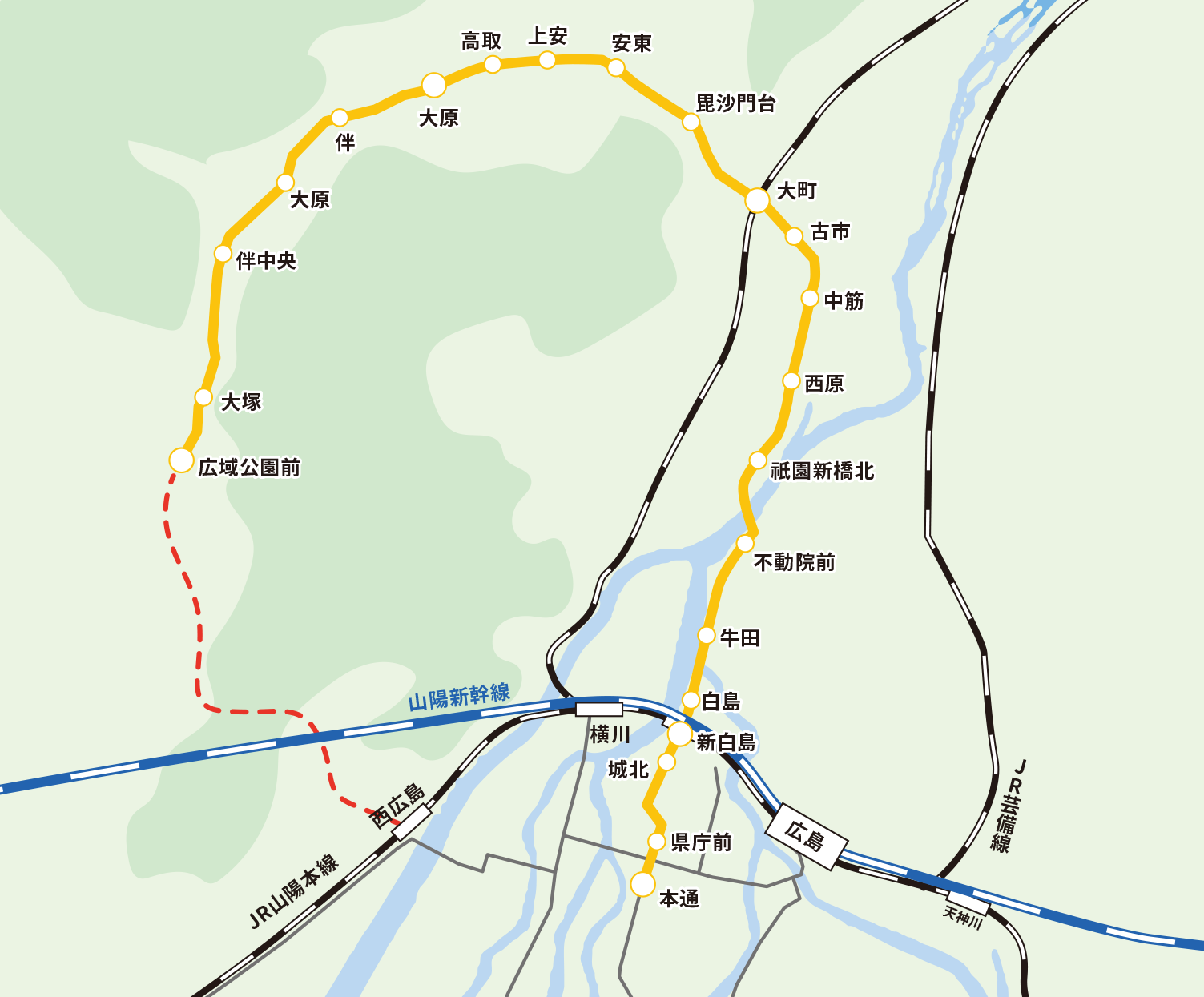 元々、広島市中心部から安佐南区の長楽寺駅(ちょうらくじえき)までを結ぶ予定でしたが、1994年10月の広島アジア大会の開催決定を受け、アジア大会のメインスタジアム・広島広域公園陸上競技場(現・エディオンスタジアム広島)へのアクセス路線として延伸が決定。