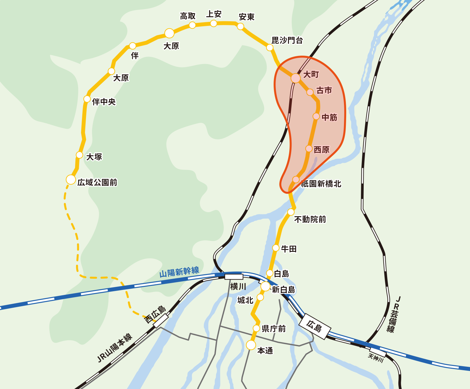 アストラムラインに加えて、西側をJR可部線(かべせん)が並走しているため、広島市の中では公共交通機関が非常に充実したエリアと言えるでしょう。特に、アストラムラインとJR可部線が連絡する「大町駅」付近は、広島市中心部や北部、北東部へのアクセスがとても便利な場所になっています。