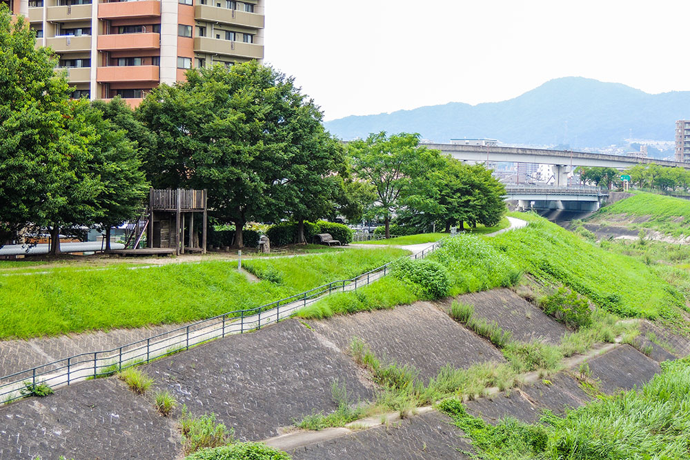 大通りから街の中に入ると低層の集合住宅や戸建て住宅が増え始め、静かな住宅街らしい街並みが広がっています。川沿いにはお散歩やジョギングが捗りそうな美しい遊歩道があります。