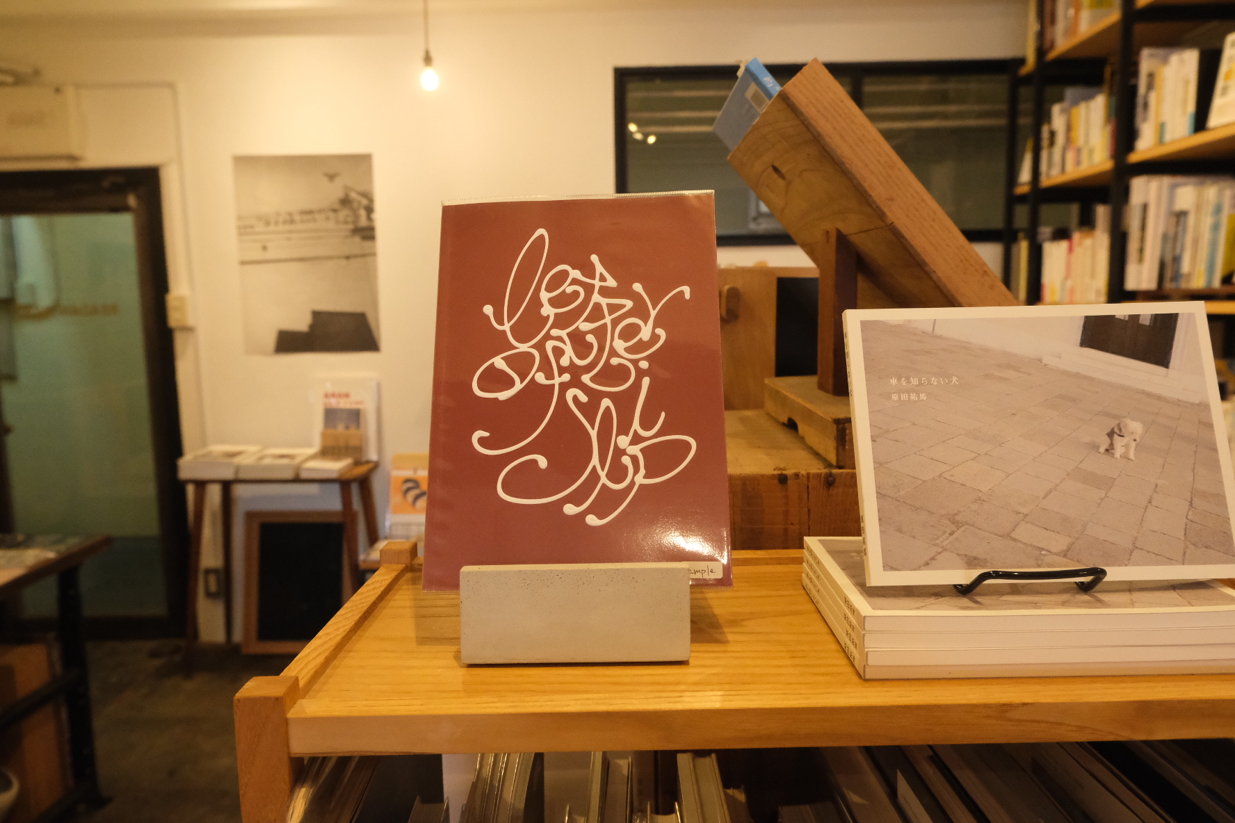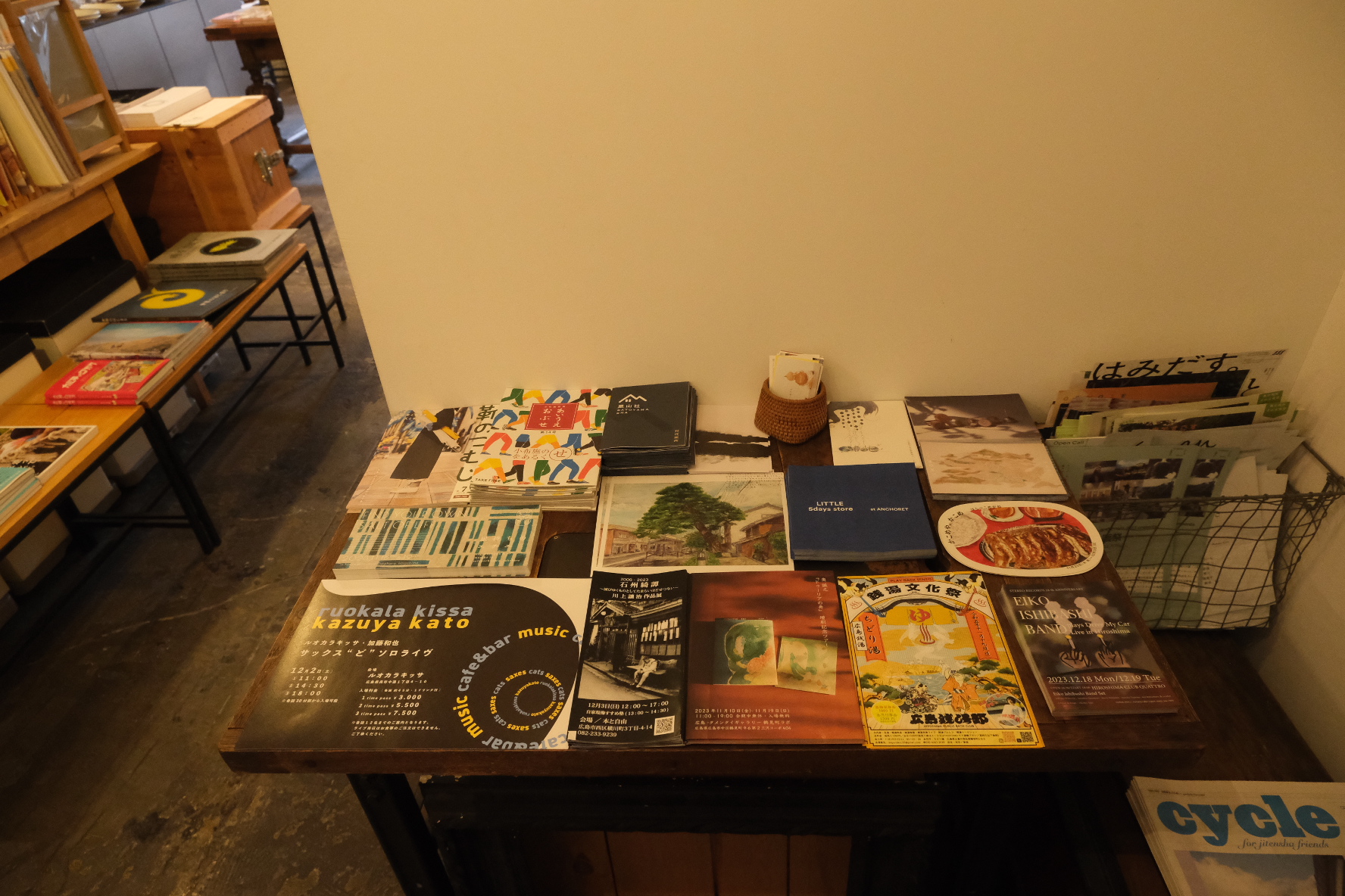 ビルの階段を上がってすぐ、暖かなオレンジ色の灯りが溢れるドアを開けると、まず出迎えてくれるのはたくさんのフライヤー。近隣のお店のチラシやイベントのチラシなど心くすぐるチラシが所狭しと置かれています。中に足を進めると、デザイン、住宅、アートなどの本をはじめとする書籍。さらにはリトルプレス、絵本といった幅広いジャンルの書籍がびっしり並ぶ本のエリアが続きます。
