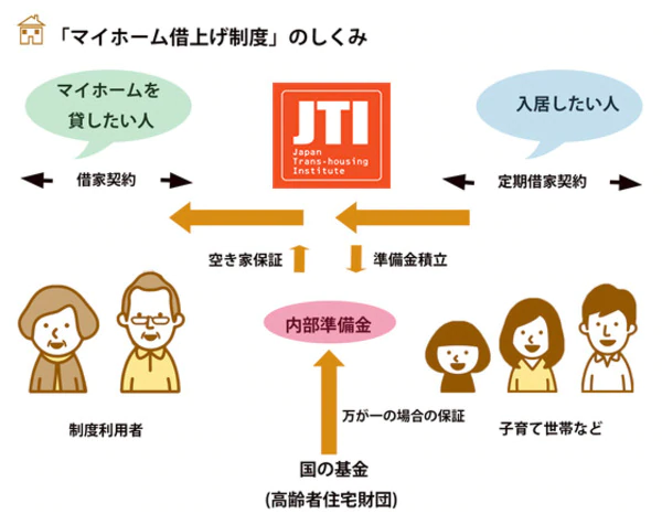 マイホーム借上げ制度とは、一般財団法人 移住・住みかえ支援機構(JTI)のサービスで、シニアの方々(50歳以上)のマイホームを借上げて転貸し、安定した賃料収入を保証するものです。これにより自宅を売却することなく、住みかえや老後の資金として活用することができます。