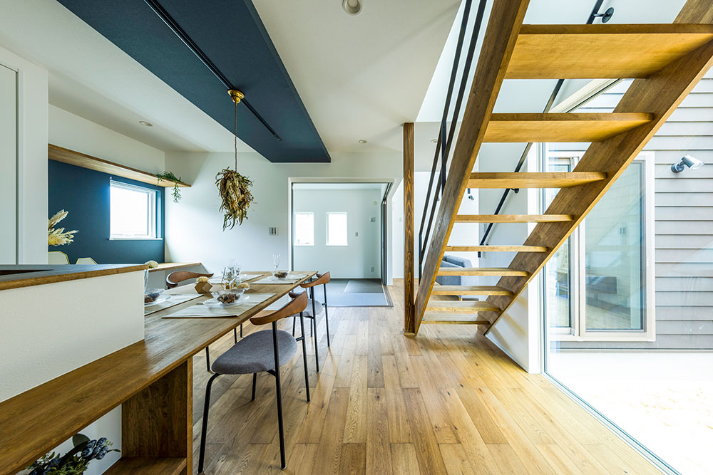 リビングとキッチンの結節点には、スケルトンタイプのリビング階段。床や階段は木製でナチュラルな印象ですが、黒いアイアンの手すりや、ダイニング天井にある間接照明の入った黒い梁によって、甘さ控えめで都会的な空間に仕上がっています。