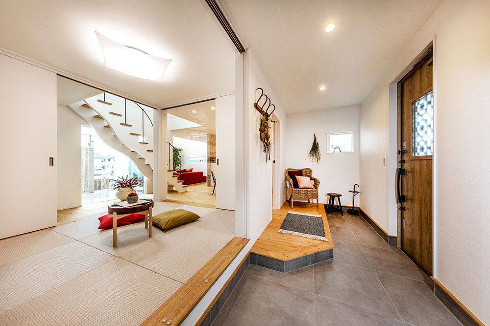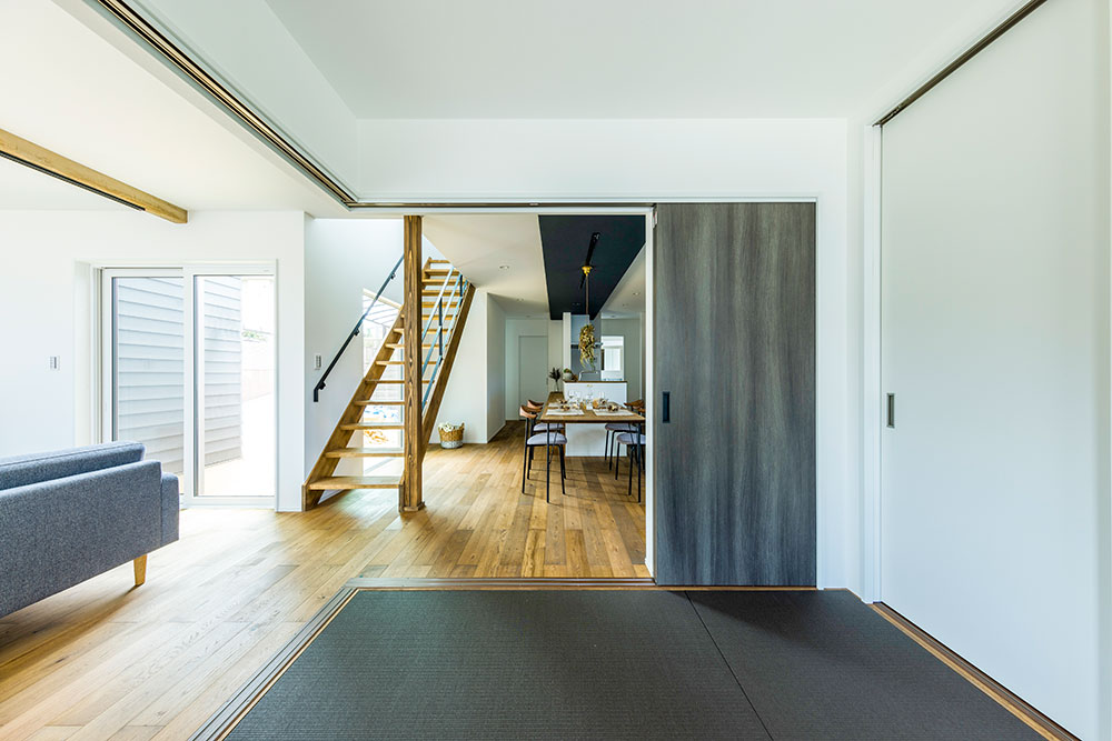 和室の引き戸を全開にすると、家の端から端までが繋がる大空間が出現します。