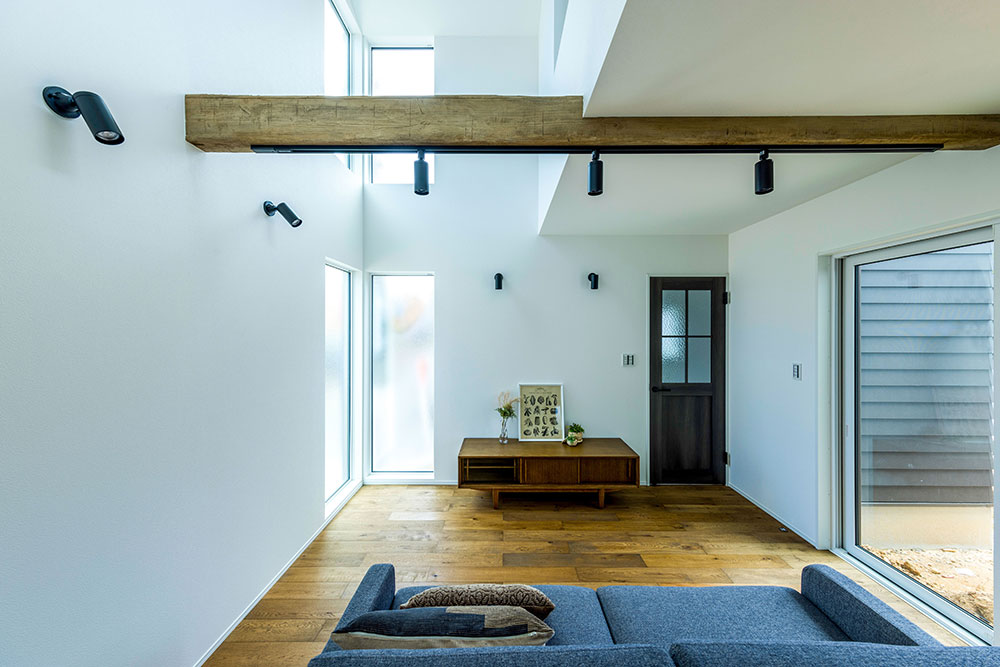 吹き抜けの角にまるでホテルのロビーのようなダイナミックな4つの窓のあるリビング。吹き抜けを渡るアンティークな梁も印象的です。