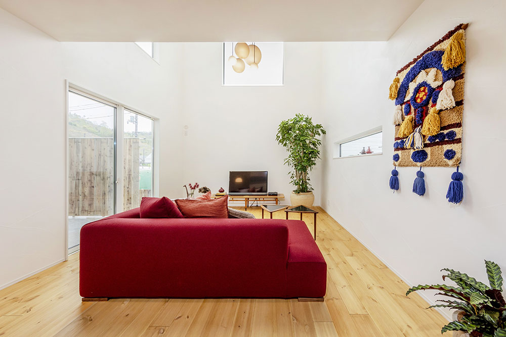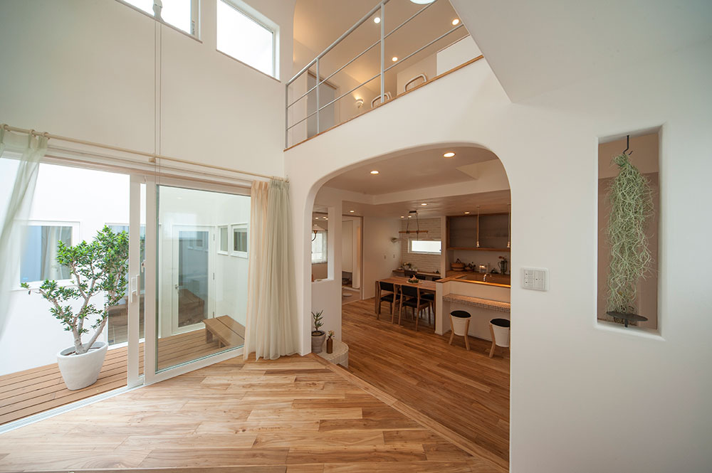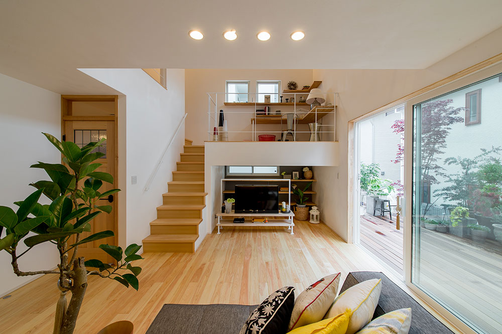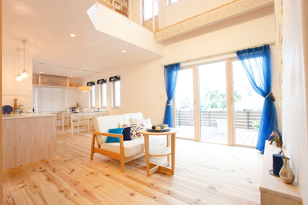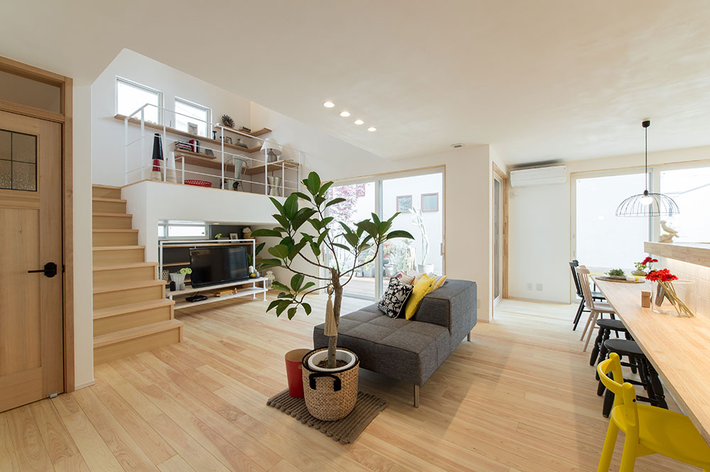 明るいブラウンの無垢材に白壁のリビング。吹き抜けから差し込む光によって、優しく淡い色彩がさらに明るく感じられる空間になっています。