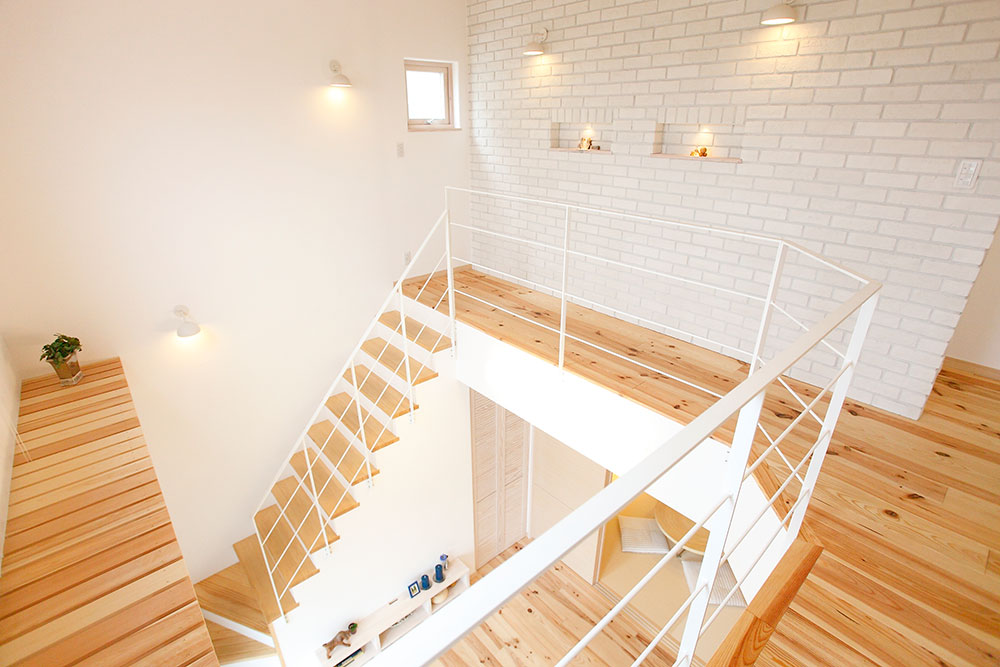 2階廊下からリビングを見下ろすとこのような感じ。2階廊下の煉瓦調のアクセントクロスも白っぽいグレーで、空間が広々と感じられるように工夫されています。