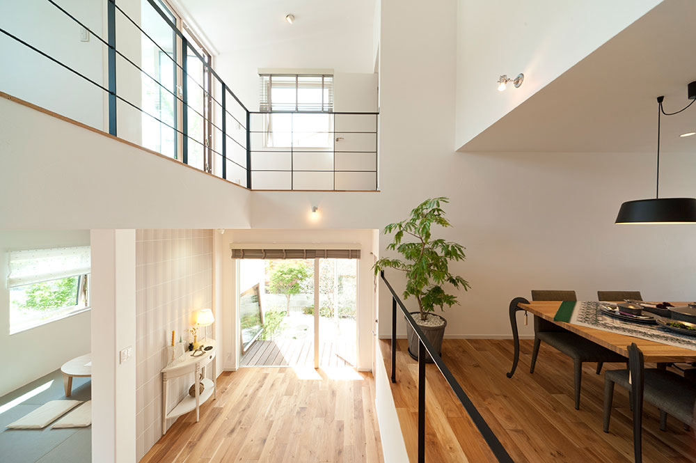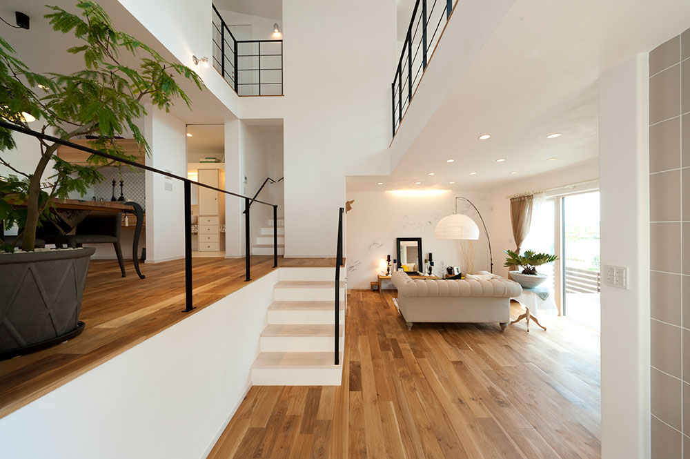 こちらの吹き抜け+リビング階段は、「2階建てでありながら4層構造」という一見風変わりな造り。無垢材の床と白壁というナチュラルテイストな要素に、黒のアイアンの手すりや近未来的な複層構造というクールな要素が取り入れられています。