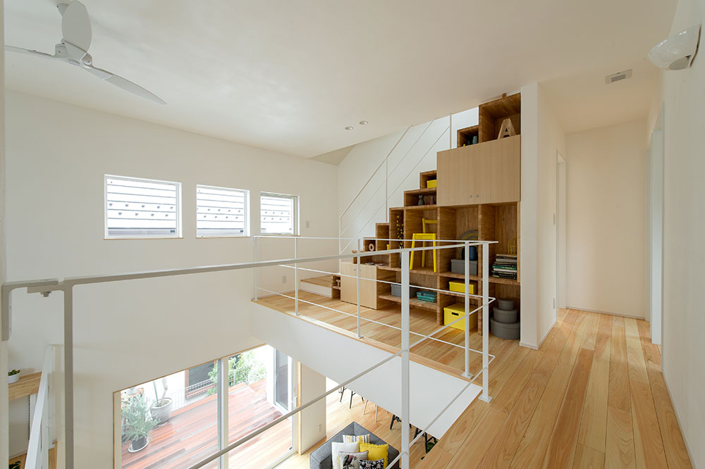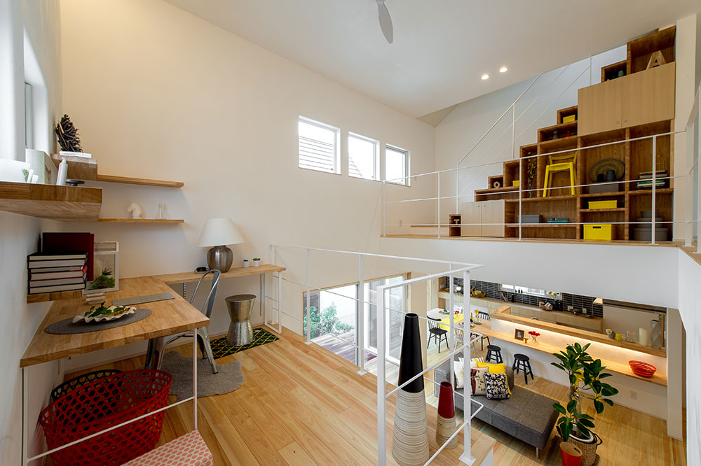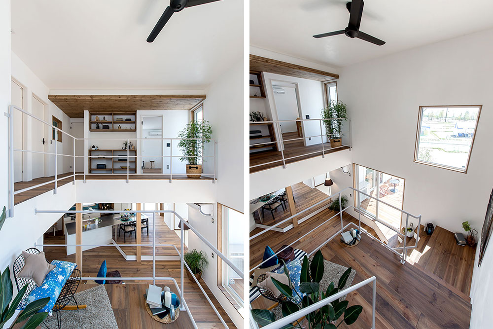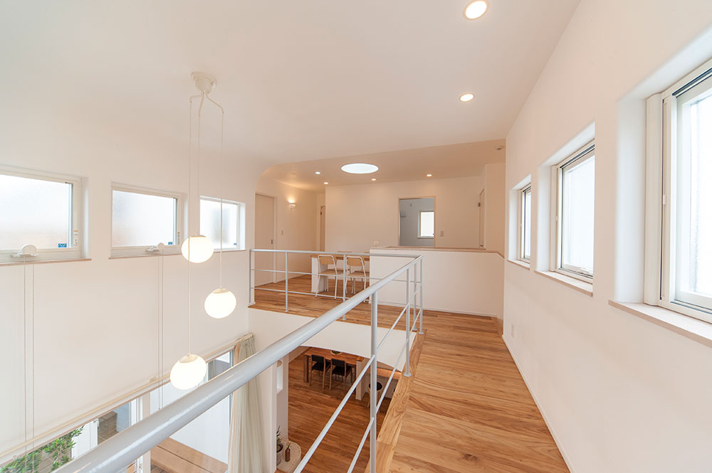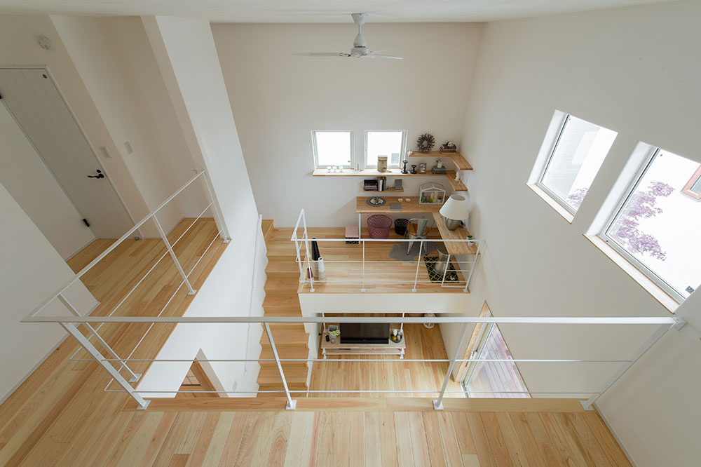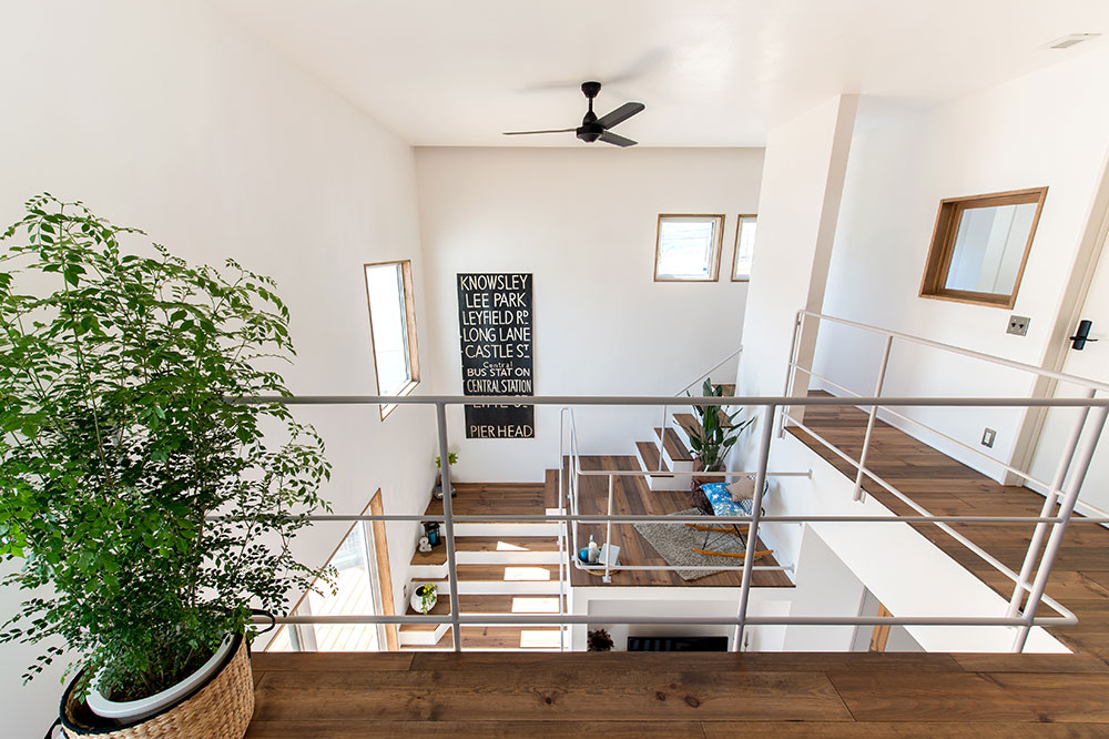 2階の廊下からリビングを見下ろすとこのような眺めになっています。日中は、2方向に配置された高窓から明るい自然光が差し込みます。