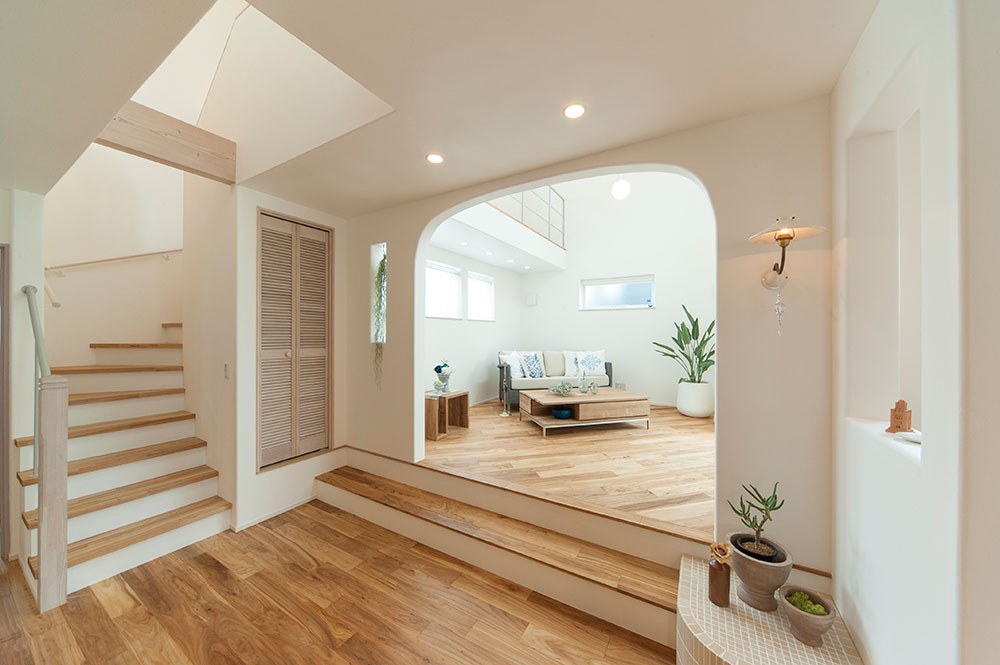 1. 吹き抜けから明るい光の差し込むナチュラルな家
