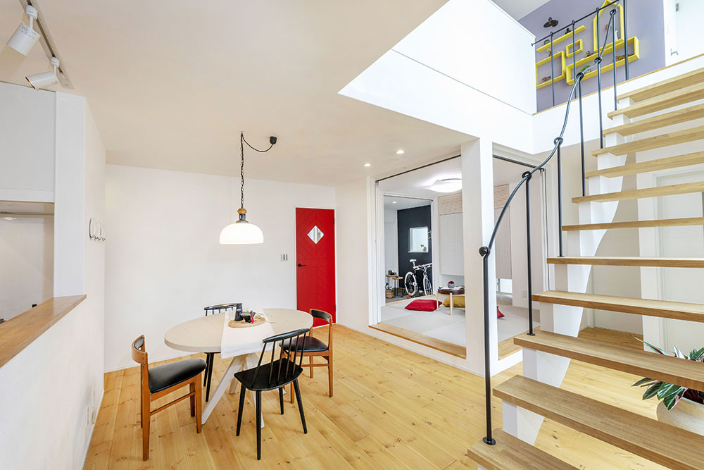 こちらはリビングがスキップフロアになっている例。2階への階段は、ダイニングの床と同じ高さからぐるりと回るように2階へとつながります。