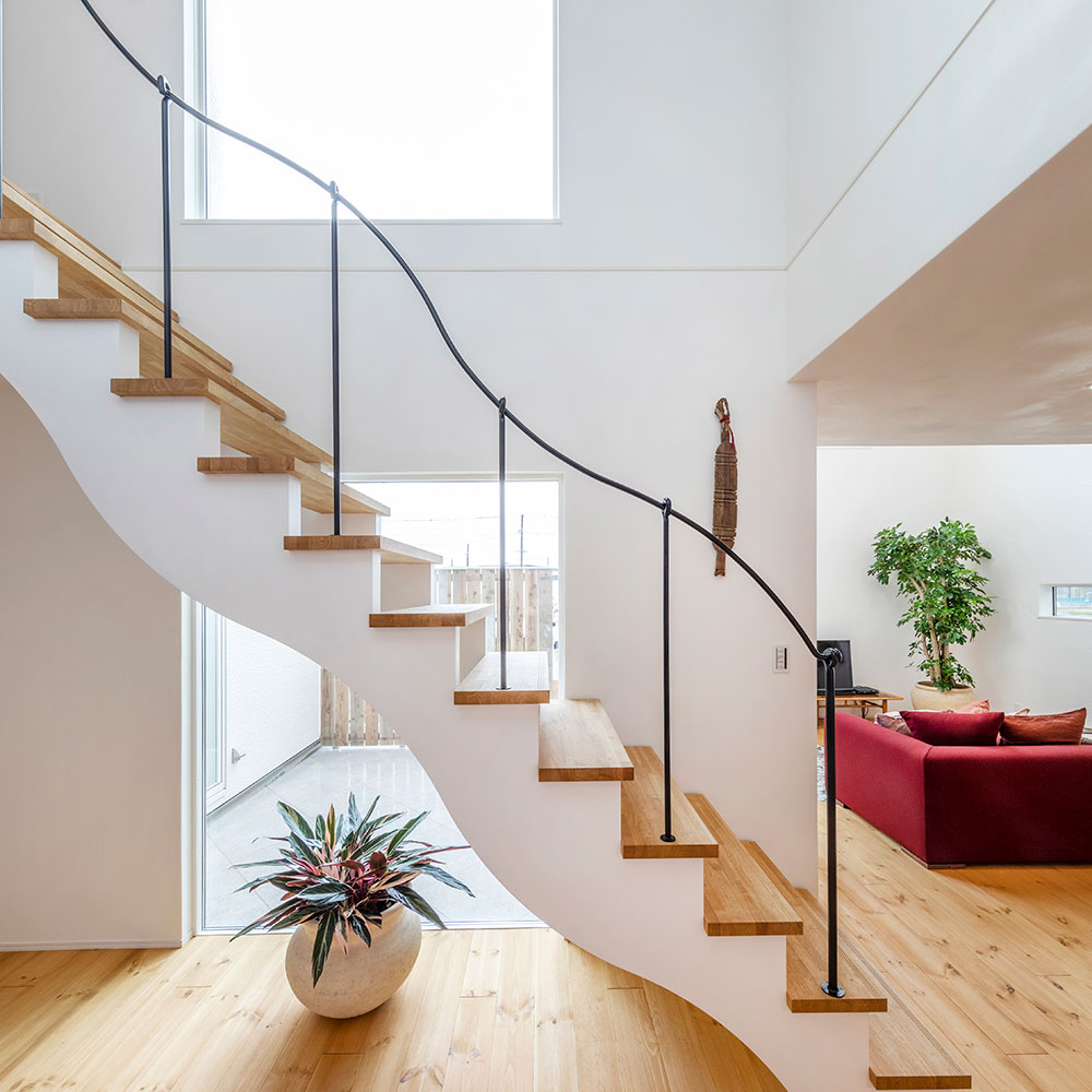 階段は独特のウェーブ状の形状。手すりも階段に合わせて波打った形の黒いアイアンになっています。