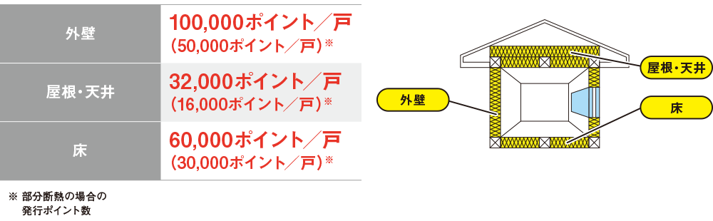最低使用量以上の断熱材を使用する改修について、施工部位ごとに1戸あたり、下記のポイント数が発行されます。