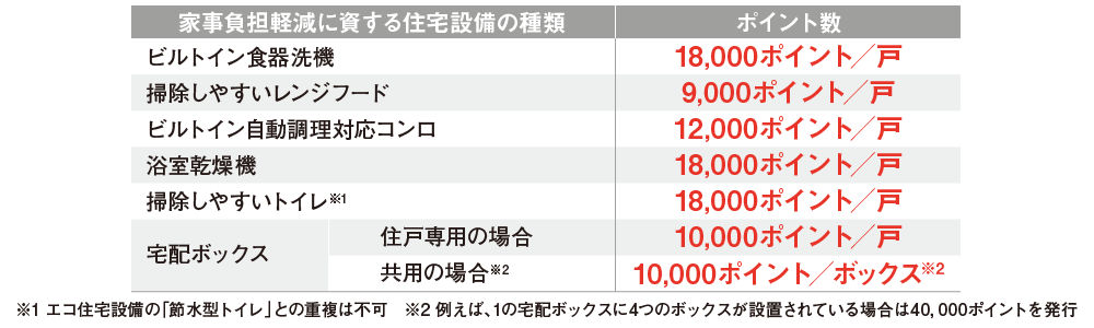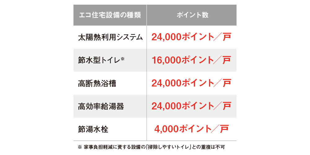 下の表にある住宅設備を設置するとポイントが発行されます。