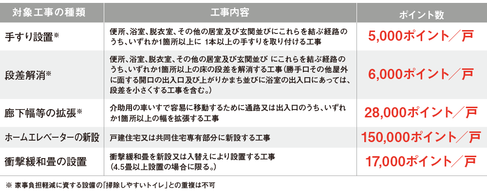下の表にあるバリアフリー工事の種類別でポイントが発行されます。