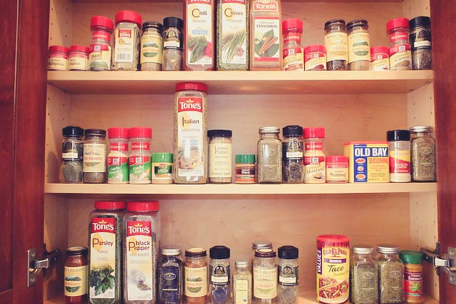 調味料は料理や食事の際にさっと取り出せるように、カゴなどに入れて収納棚の中に格納しておきましょう。
