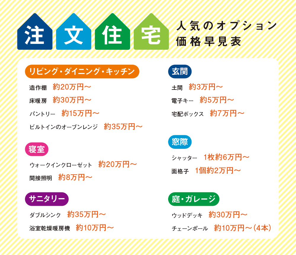 満足度が高く、費用面でも納得できる注文住宅を建てるには、こだわりたいオプションと、不要なオプションを見分け、取捨選択をする必要があります。ここでは一般的に人気のオプションの特徴と価格をまとめましたので、悩んだらこれを見て決めてみてはいかがでしょうか。