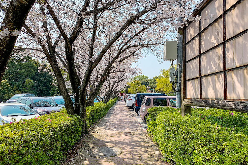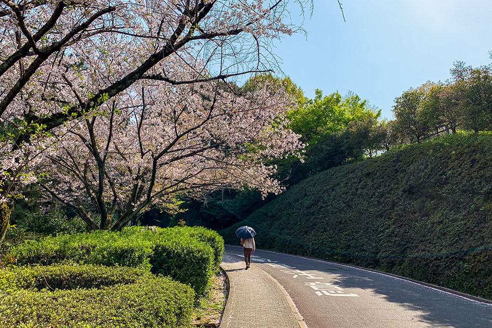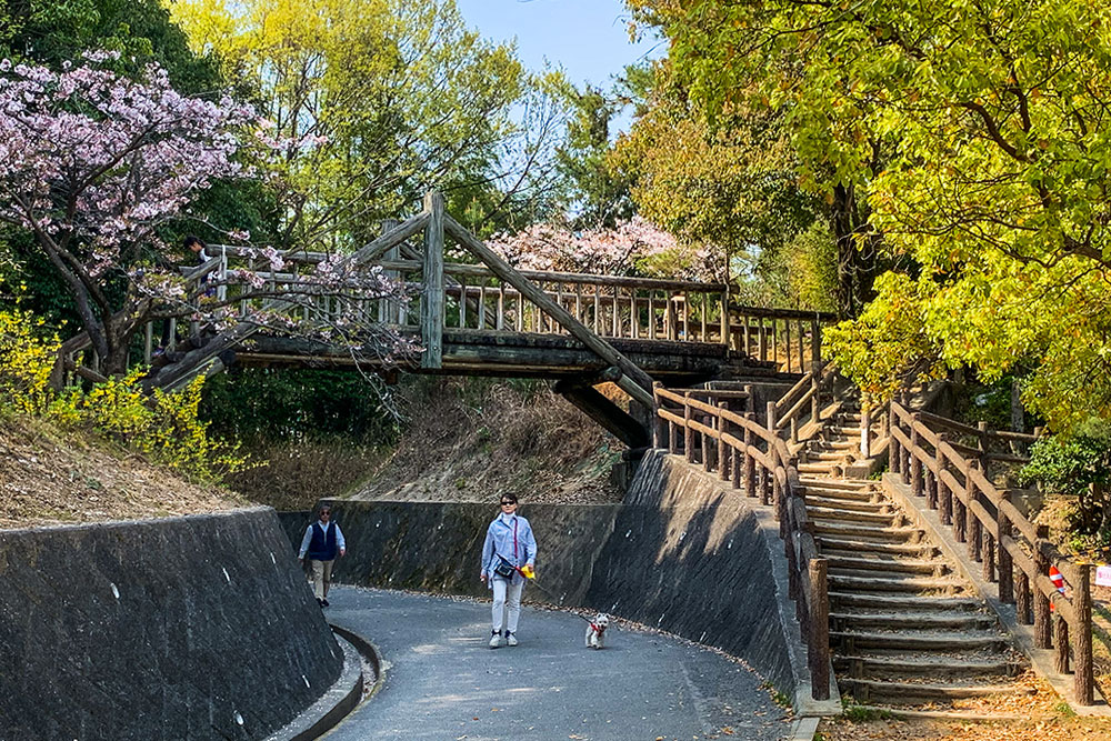 浜田と南隣の鹿籠(こごもり)の間にまたがる山の上にある「空城山(そらじょうやま)公園」。広々とした多目的なグラウンドや、森の緑を楽しめる遊歩道、子どもたちが大喜びのアスレチック遊具や大型遊具など、多目的に楽しめる公園です。公園内には桜が植えられており、シーズンにはお花見にくる人で賑わっているようです。