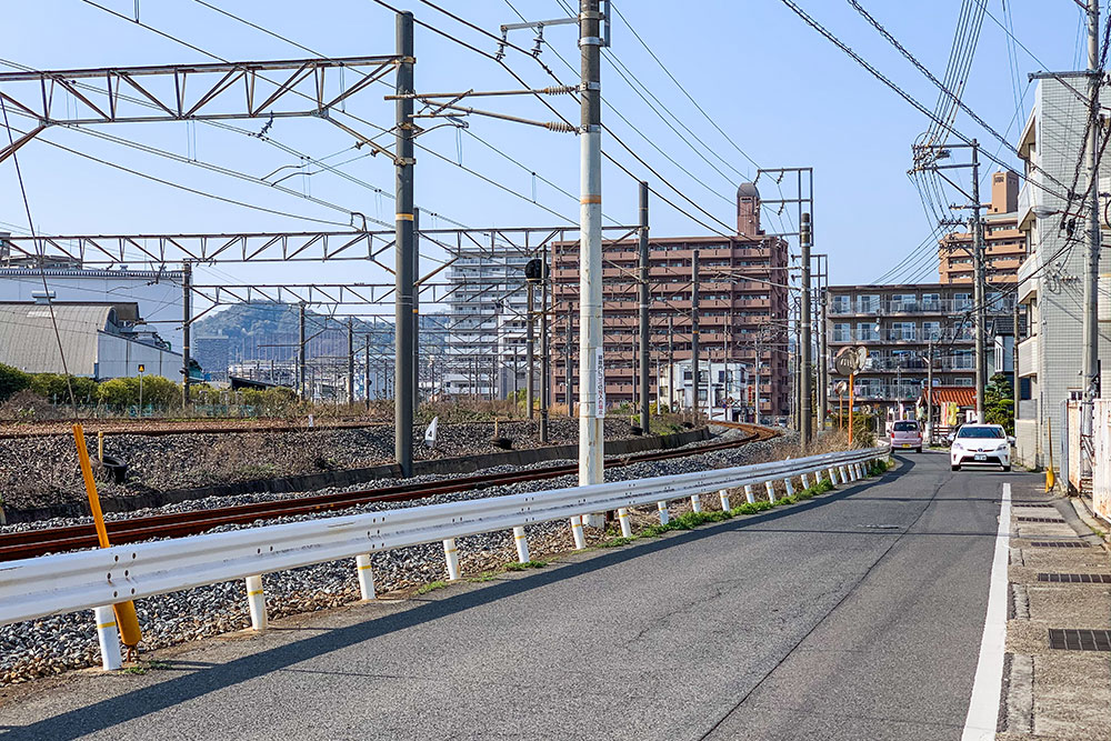 緑ヶ丘の西側は、JR山陽本線と呉線が走る線路となっています。緑ヶ丘側から線路の向こう側へ渡る踏切はありません。線路の向こう側に行くには西隣の茂陰(もかげ)にあるアンダーパスを利用すると便利になっています。