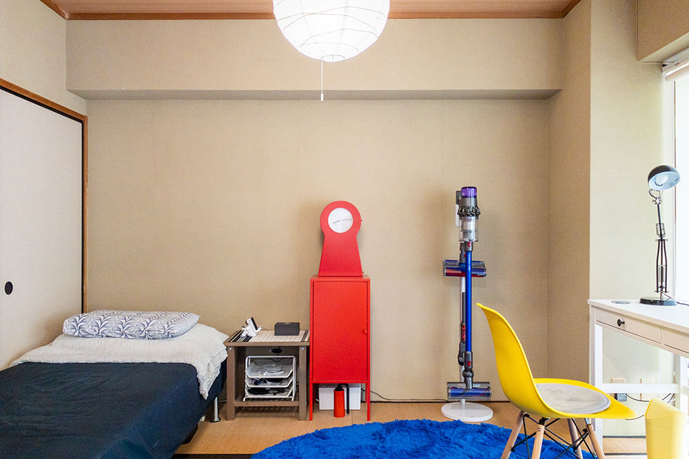 壁側中央に置かれた真っ赤な棚と置き時計は、IKEAの別々のシリーズの商品を組み合わせたもの。金属の質感と塗料の色がほとんど同じなため、まるでセット商品のように見えます。実は置き時計は時計の付いた表面が扉のように開き、中に収納があるという作りになっています。
