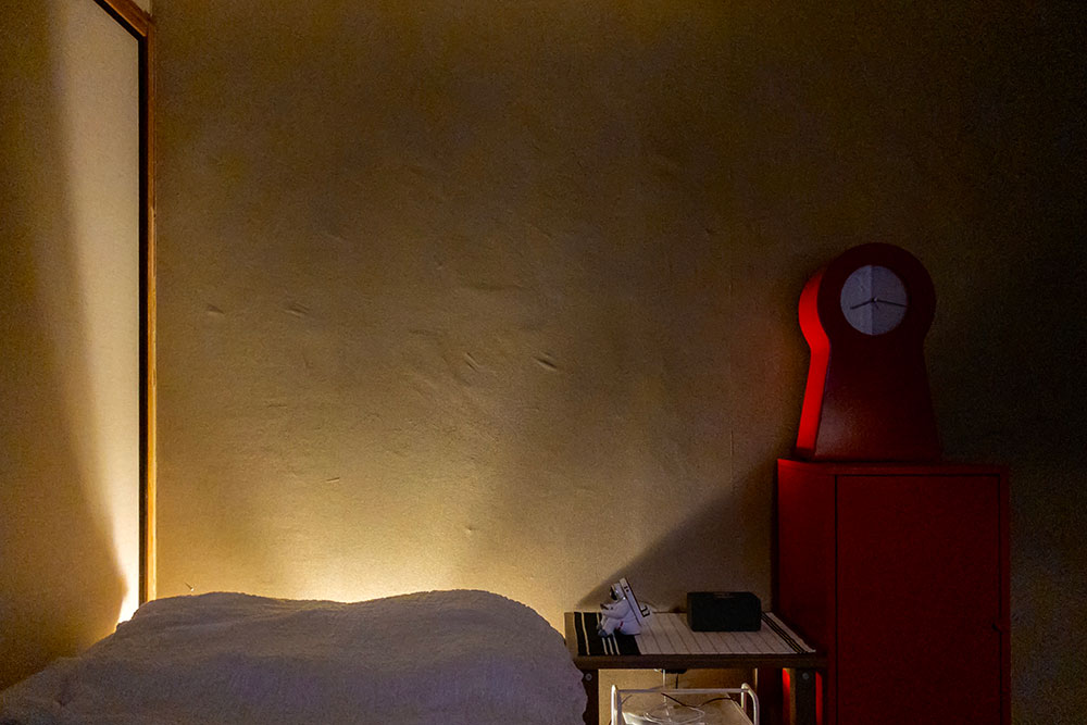 ベッドは10年以上前にIKEAで購入した脚付きマットレス(購入時¥8,400くらい)。ボンネルコイルの廉価なベッドですが、価格のリーズナブルさを考えるとなかなかの寝心地だそう。夜間はベッドと壁の隙間に忍ばせたテーブルランプ(購入時¥699)を点けてホテルのような間接照明に。庶民的な価格帯のものを組み合わせ、少しでもラグジュアリーで落ち着ける空間を作りたいのだそうです。