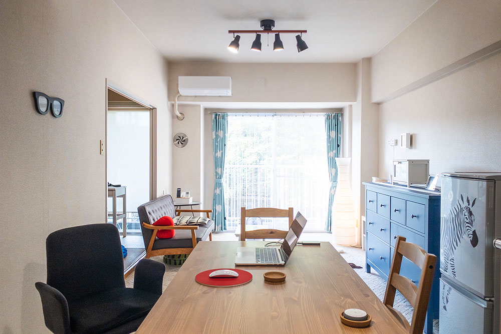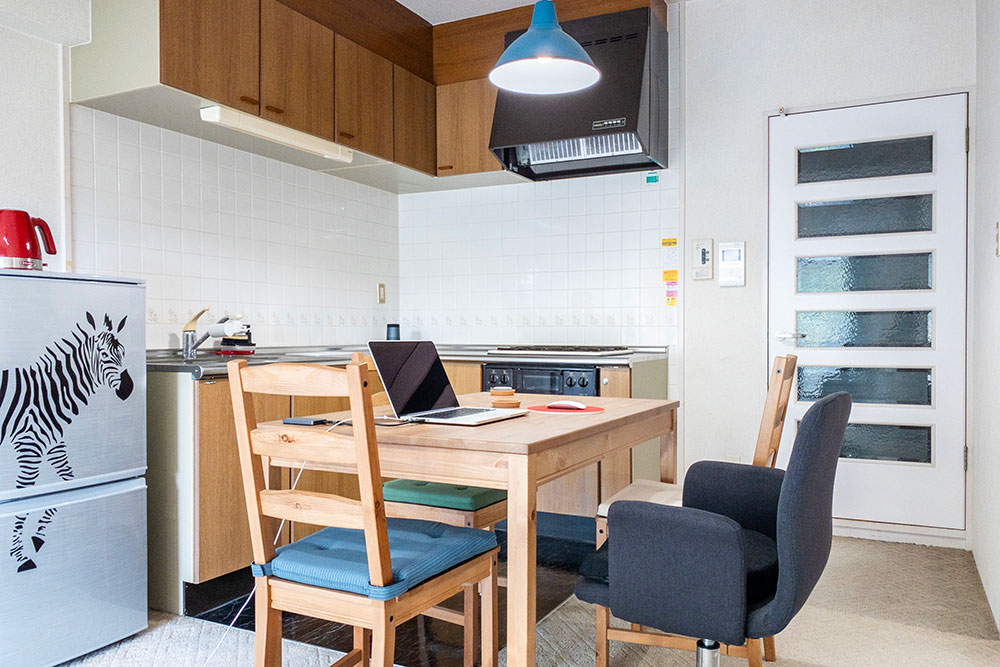 テレワークを開始して一週間後、元々のダイニングセットの椅子では足腰が痛くなってきたため、写真手前のキャスター付きのオフィスチェアを購入。身体的なダメージを緩和することで、仕事の能率が上がったと感じているようです。冷蔵庫は知人から頂いたもの。本来は壁に貼るウォールステッカー(¥1,000)を貼り、室内にアクセントを与えています。