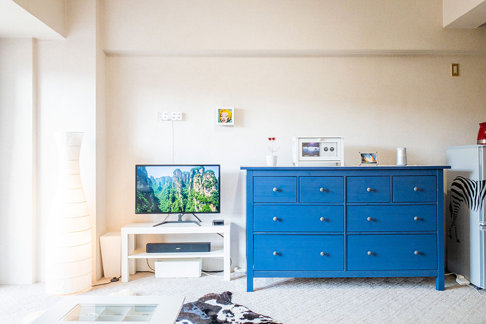 写真右側のブルーのチェストは、10年前に購入したIKEAのHEMNESというシリーズのもの。現在も同じデザインチェストは販売されているものの、青色は廃盤となっているようです。モニター(テレビではない)を置いているテレビボードも同じくIKEAで¥1,499(購入時)だったもの。家具にはとことんコスパを求めるのがモットーなのだとか。