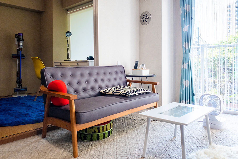 ダイニング横のリビングスペースは、白や後退色の青の家具を配置。さほど広くはないリビングを広く見せるメソッドを取り入れ、休憩時間は開放的な場所で過ごせるように工夫しているそうです。