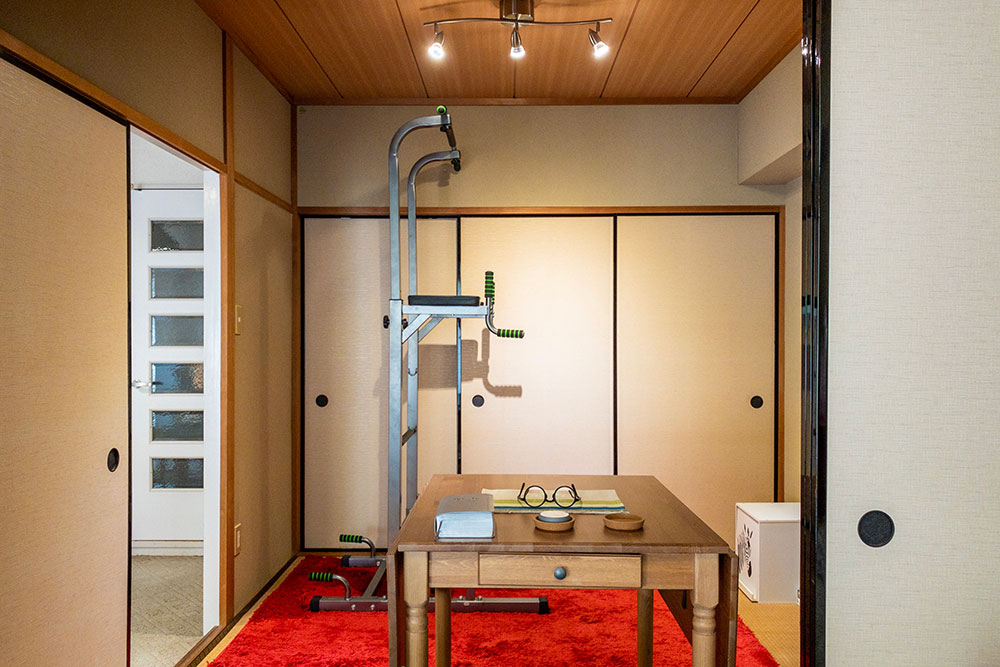 ベッドや収納などの大型家具を他の部屋に移動し、懸垂やダンベルなどを使った運動ができるような広い空間のあるトレーニングルームに改造しました。運動スペースを広くしたことで、以前よりも懸垂台に手が伸びるようになった…かは定かではありません。
