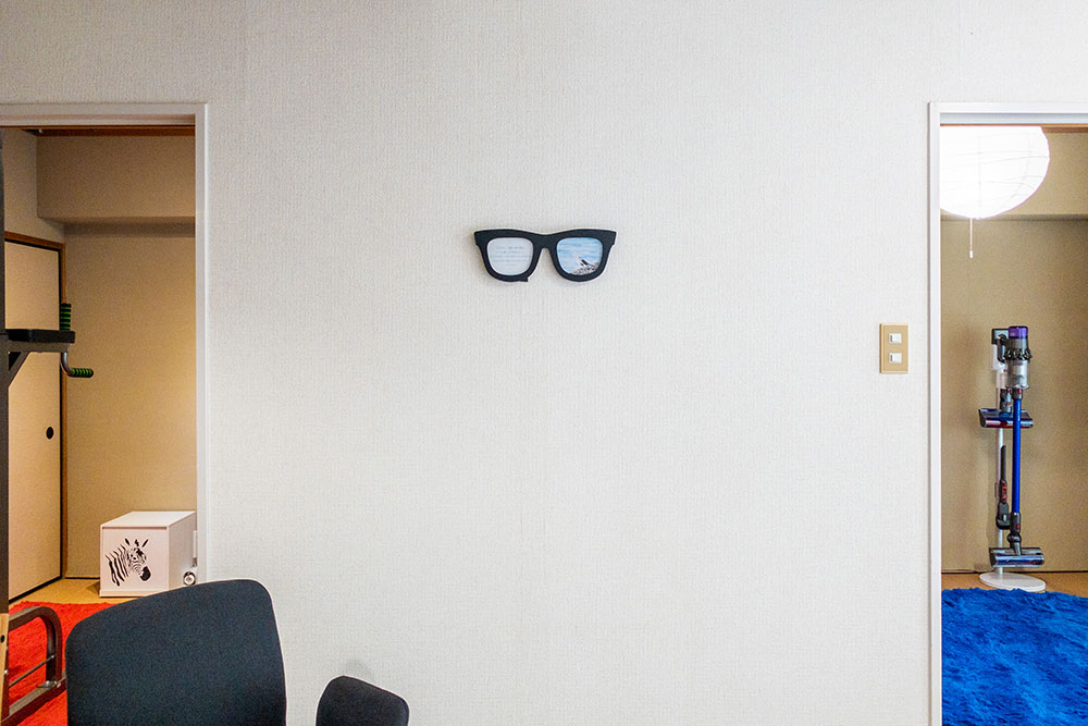 ビデオ会議が週に数回あるSさんの職場。真っ白かつ、家具を置いていない壁がほとんどなかったため、このような背景でビデオ会議に臨んでいます。壁にかかっているメガネ型の額縁は、フライングタイガーコペンハーゲンで¥600ほどで購入したもの。偶然にも本人がかけているメガネのデザインと酷似しており、会議の際ちょっとしたネタにできるそうです。