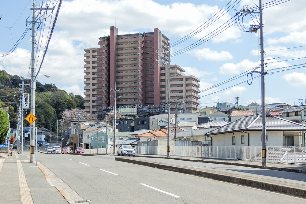 府中町の平地の鶴江(つるえ)のすぐ西側の高台に造成された団地・城ヶ丘。団地の中は斜面が急な場所もあるものの、平地の鶴江まで物理的に距離が近いことや、路線バスが団地の入口に停車するため、公共交通機関を使った通勤・通学には便利な場所と言えます。