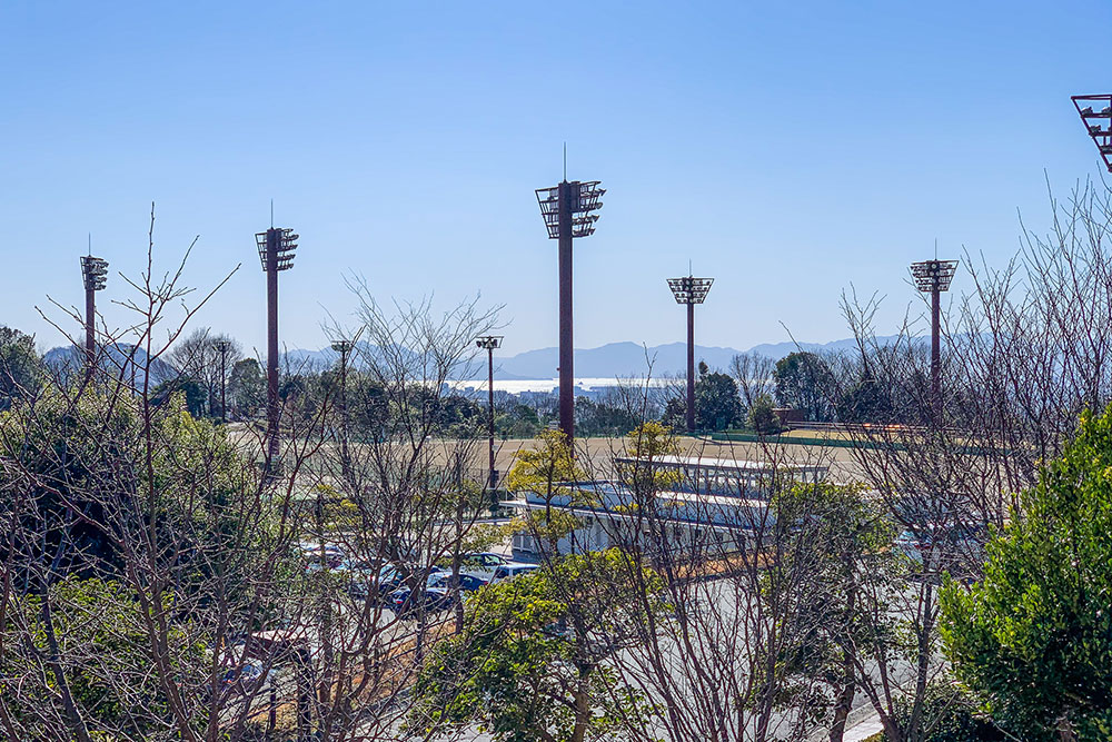 住宅街のさらに上の山間には、1996年の国体のサッカーの競技場としても使用された見晴らし抜群の「揚倉山(あげくらやま)運動公園」があります。休日には地域の住民が訪れ、素晴らしい眺めを楽しみながら運動しています。