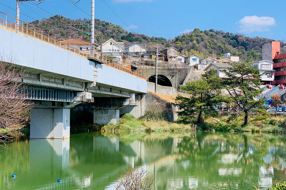 府中町を横断する山陽新幹線の北、平地の浜田本町(はまだほんまち)の西隣にある高台の街・八幡。山陽新幹線は、八幡の高台の街の中でトンネルに入ります。