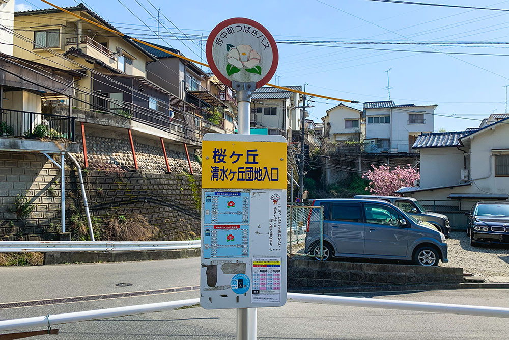 桜ヶ丘は、みくまりの西側の山の上に造成された団地。みくまりと同様、路線バスがなく、公共交通機関はコミュニティーバス「つばきバス」を利用する必要があります。