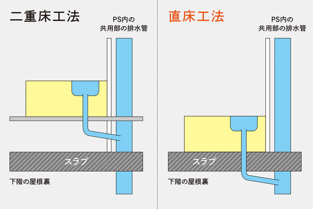 水回りの位置を大きく変えるリノベーションを考えている場合、目当ての物件が「二重床工法」か、そして「PSの位置はどこか」と言う点を見ておきましょう。