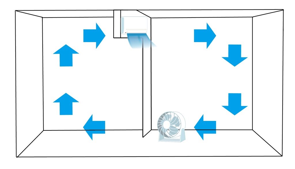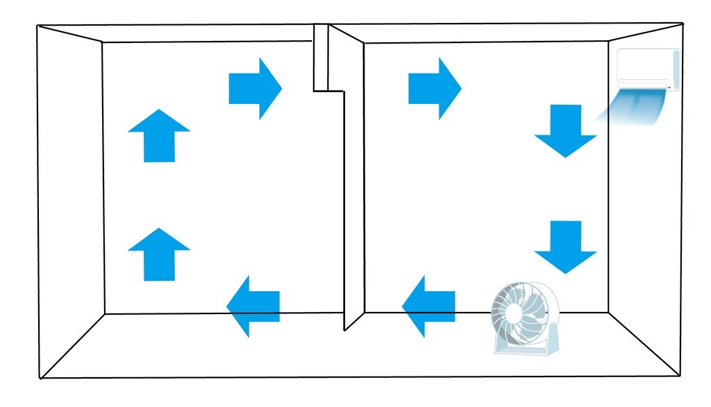 エアコンの位置が隣接する部屋との仕切り部分にある場合は、サーキュレーターをエアコンの下に置き、隣の部屋に向けて風を送るようにすると上手に冷気をエアコンのない部屋にも循環させることができます。