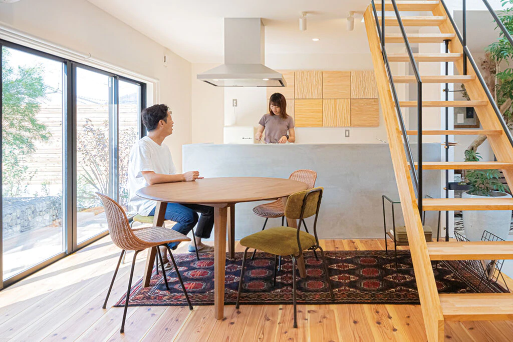 壁から独立しており、リビング・ダイニングの方を向いて料理ができるアイランドキッチン。左右どちらかが壁にくっついている対面キッチンや、リビング・ダイニングに背を向けて料理をすることになる壁付キッチンと比較すると、「キッチンに籠って料理をしている」という感覚を持つことなく開放的に料理ができます。