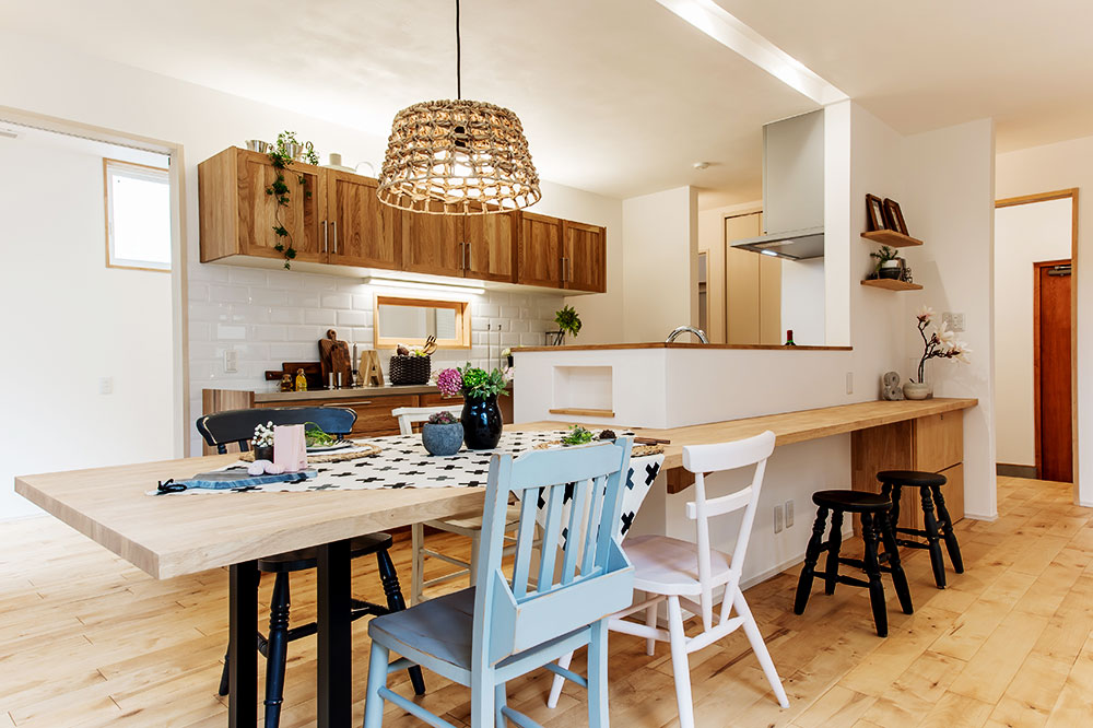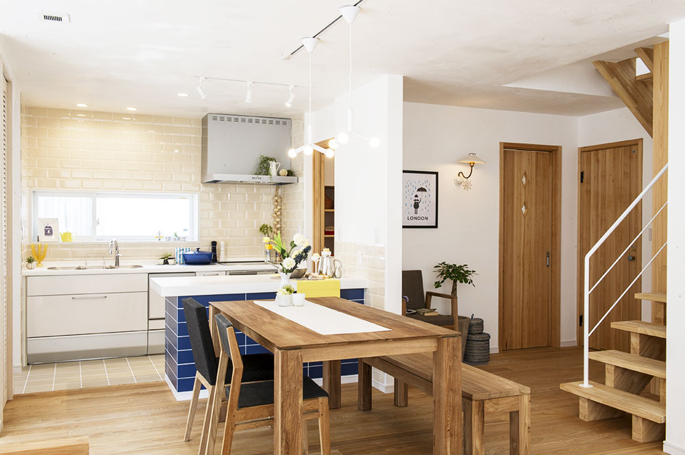 ホワイト・ブラウンが基調のウッドテイストの空間に組み込まれた、深いブルーのタイルのキッチンが映えるお部屋。黄色のクロスや青い鍋など、小物にも彩りを感じられます。