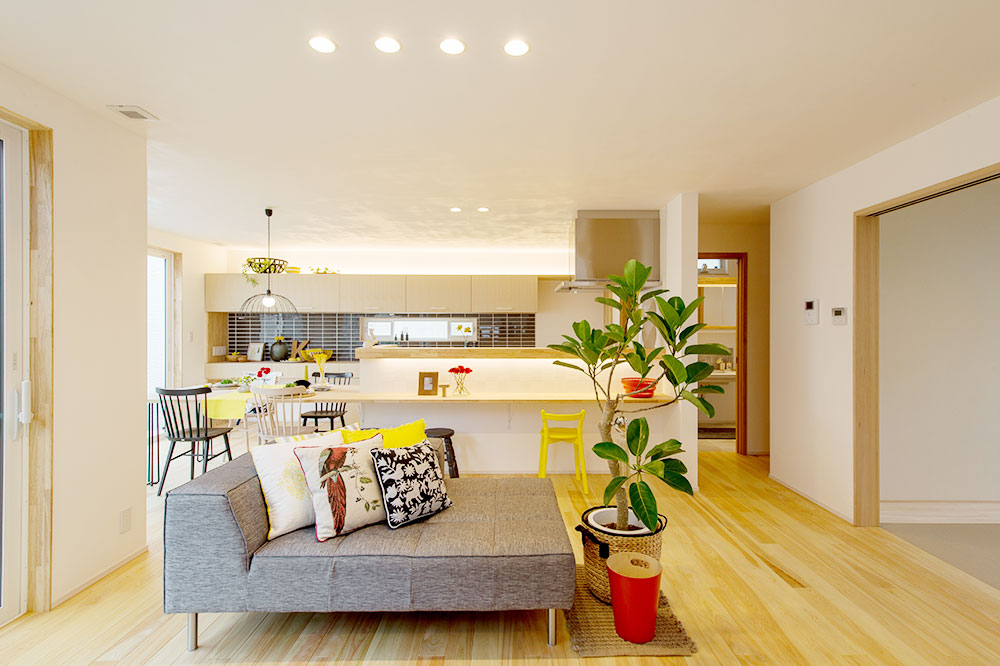 鮮やかな柄のテーブルクロスやブルーの引き戸、ソファの黄色いクッション、そして中央のアクセントクロスなど、カラフルな色が点在するお部屋。バランスよく配置されたグリーンも空間に潤いを与えてくれています。