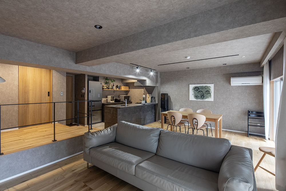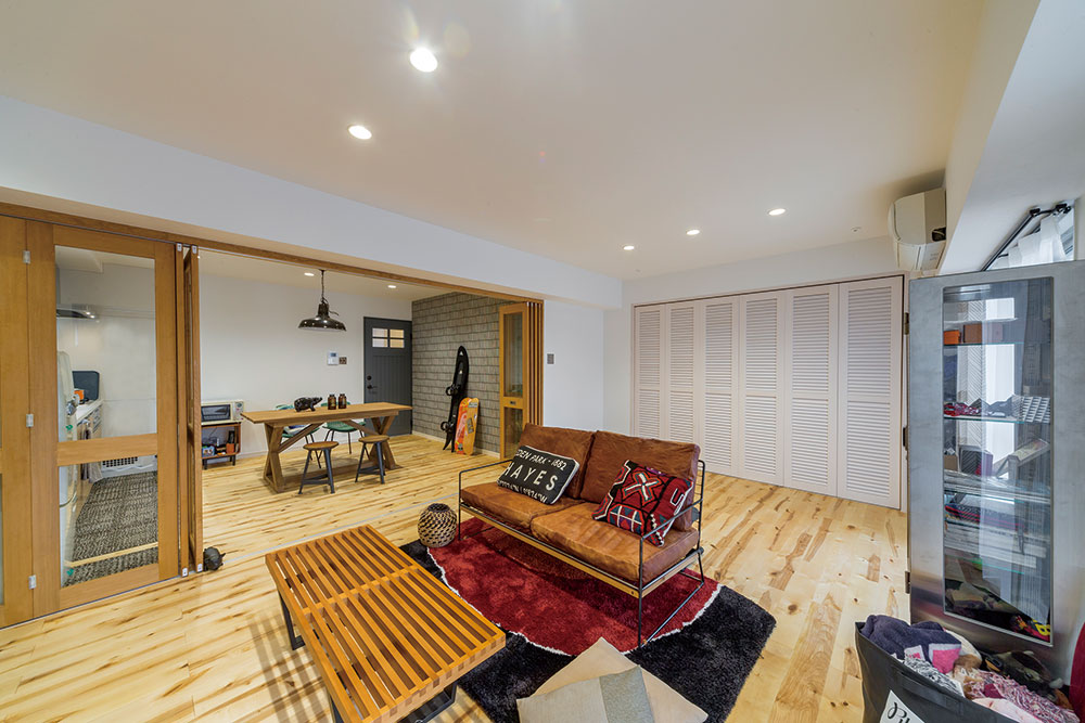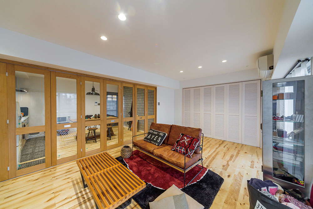 マンションの中部屋であっても部屋中に光が差し込んで明るくなったり、少々占有面積が狭くても開放的な雰囲気を演出できるなどのメリットがある、この「広いワンルーム」リノベーション。しかし、家族数名で生活することを考えた場合、やはり気になるのがプライベートな空間をどのように確保するかということではないでしょうか。