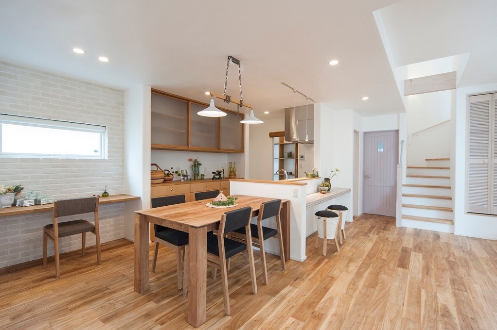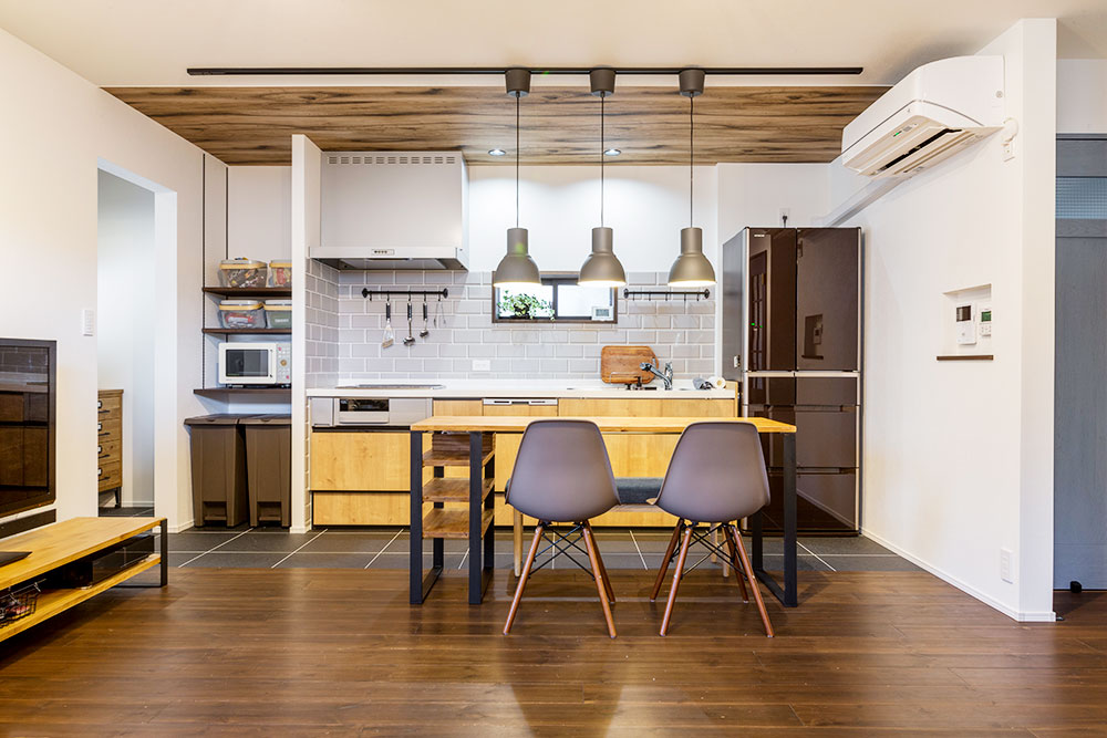 また、キッチン背面はスペースが生まれやすい場所。そこに奥行50cmくらいで横長の造作棚を設置すれば、キッチン家電だけでなく書類関係、ノートパソコン、コピー機などリビング収納も兼ねて使用することができます。椅子を用意すれば、テレワークも可能となります。リビングで家族の気配を感じながら仕事がしたいという方におすすめです。