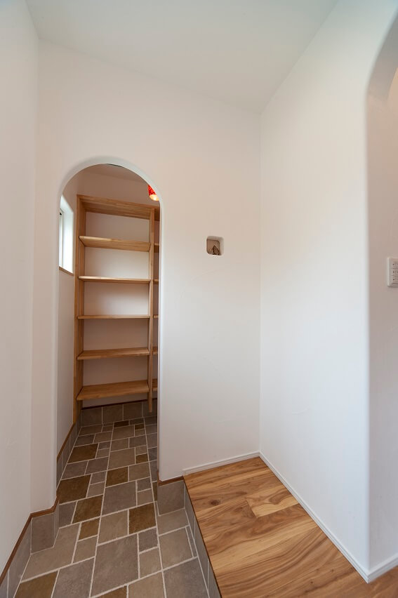 人気のパントリーは、1畳くらいあればだいたいの物は収納できます。具体的にはなりますが、極小地の場合でも、奥行と幅がだいたい45cm×91cmのサイズ感さえ確保できれば、あとは天井までの高さを利用して収納をつくると4~5人家族でも収納力はだいたい事足りますよ。それでもスペースの確保が難しい場合は、キッチン台の幅を調節したり、キッチンの壁を厚くすることで、食器や小物の収納が可能なスペースをつくれたりもします。