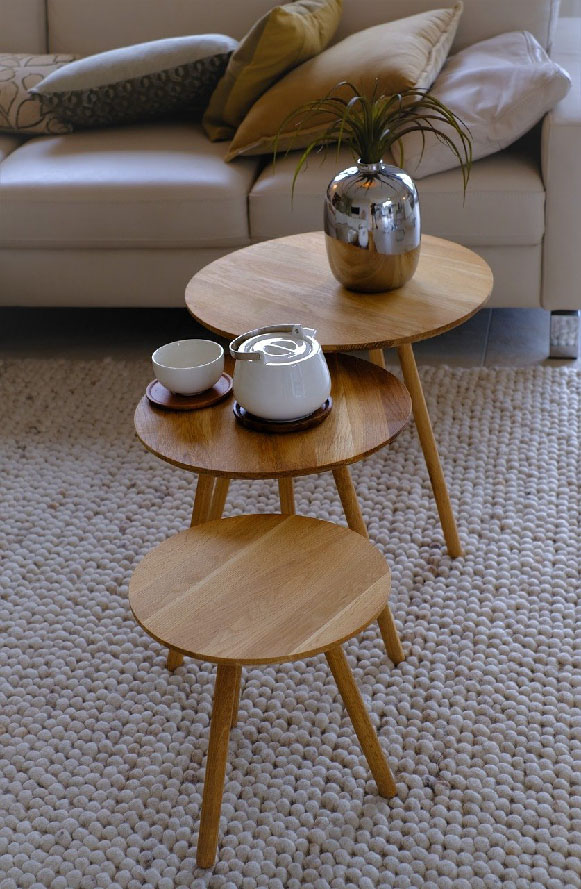 ただし、リビングで食事をとることが多い場合は、少し高めの550mm前後にすると使いやすくなります。また、スペースを取らずに収納しておける上のようなネストテーブルも使いやすいです。2~4個の相似テーブルが1組となっていて、それぞれがミニテーブルとして使え、ゲストが来た場合にも便利です。