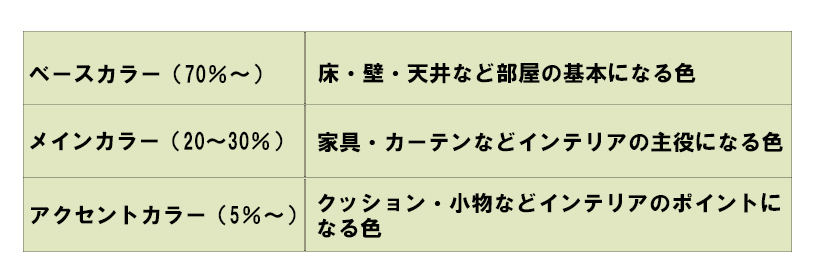 カーテンを選ぶ前に、お部屋の配色やトーンを知っておくとお部屋の雰囲気にしっくりと合うものを選びやすくなります。お部屋を構成する主な要素は、以下の3つのカラーとなります。